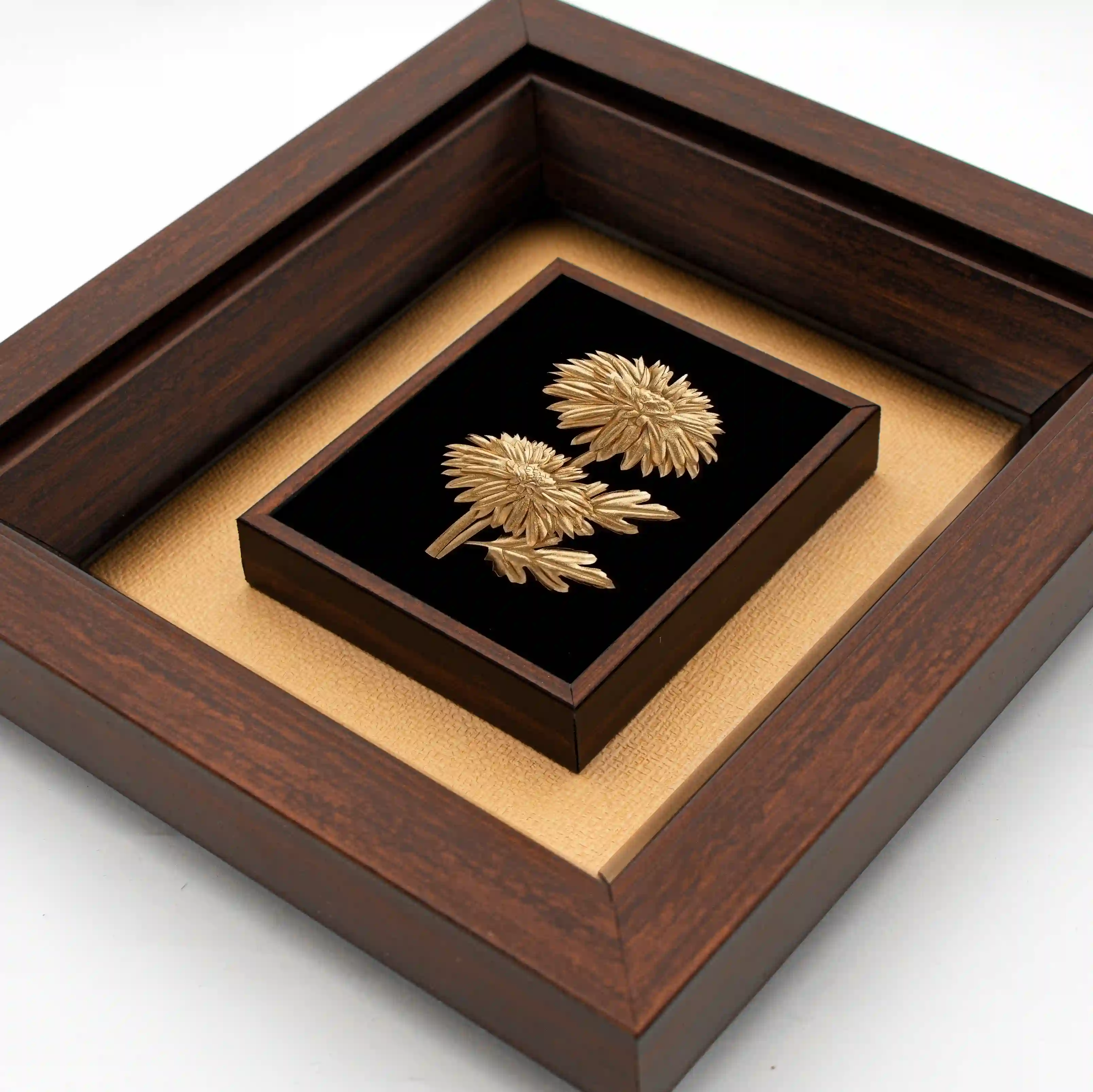 پلاک طلایی این مدل تابلو، اوج فناوری تولید در آثار هنری لاکچری را به نمایش میگذارد. برای خلق بافت پر و متراکم گلبرگهای داوودی، از فرآیندهای میکرو گالوانیزاسیون کنترلشده استفاده شده است که تضمین میکند ضخامت طلای ۲۴ عیار در تمامی نقاط یکسان باشد و نور را به صورت یکنواخت بازتاب دهد. بوم مشکی زیرین، با پرداختی مات و عمیق، زمینه لازم برای برجسته شدن حداکثری درخشش فلز گرانبها را فراهم میکند. قاب ویژه با زوایای دقیق و پرداخت چندلایه، طراحی شده تا تمرکز کامل بیننده بر روی جزئیات طلایی باشد. گواهی رسمی اصالت کالا، ضمیمه این قطعه است.