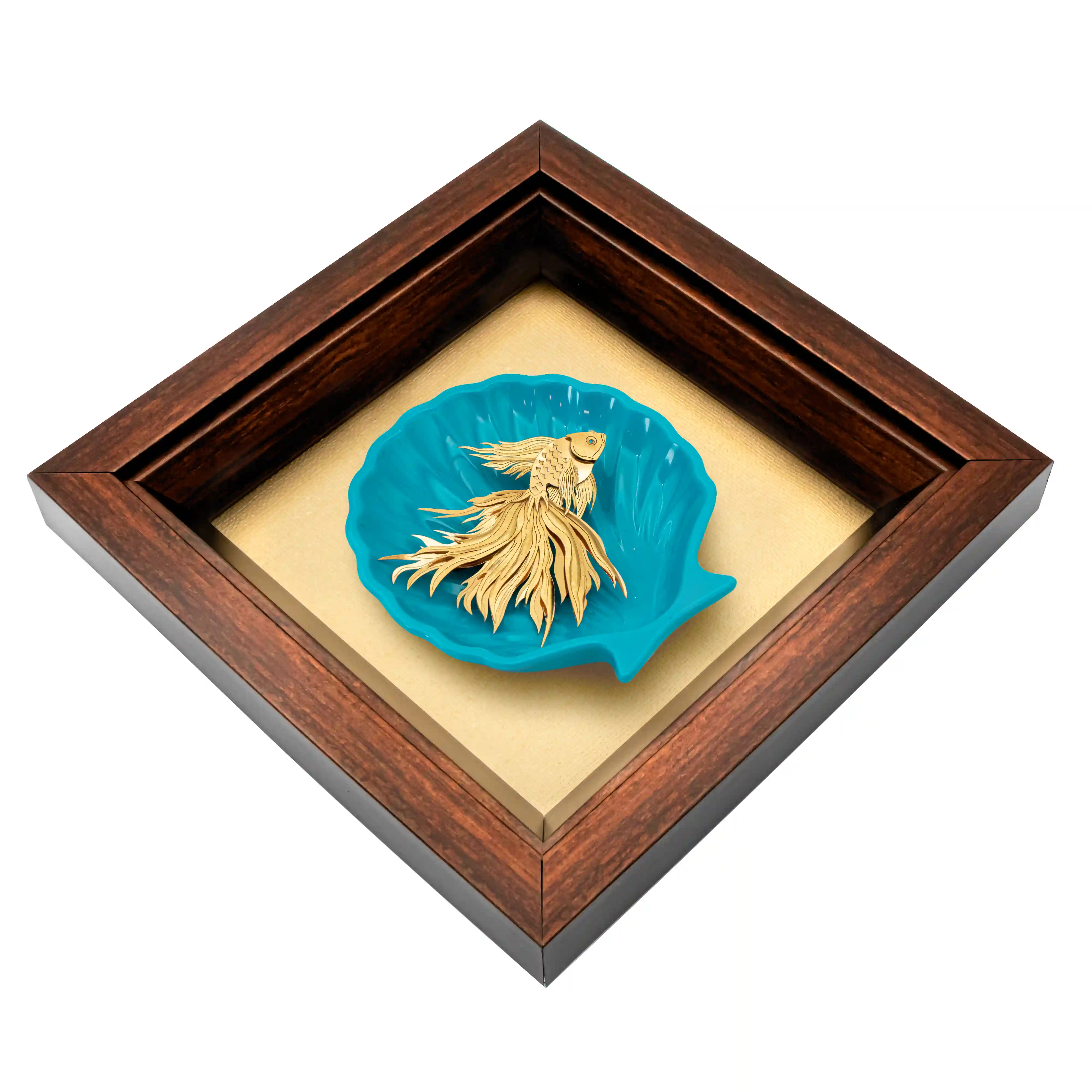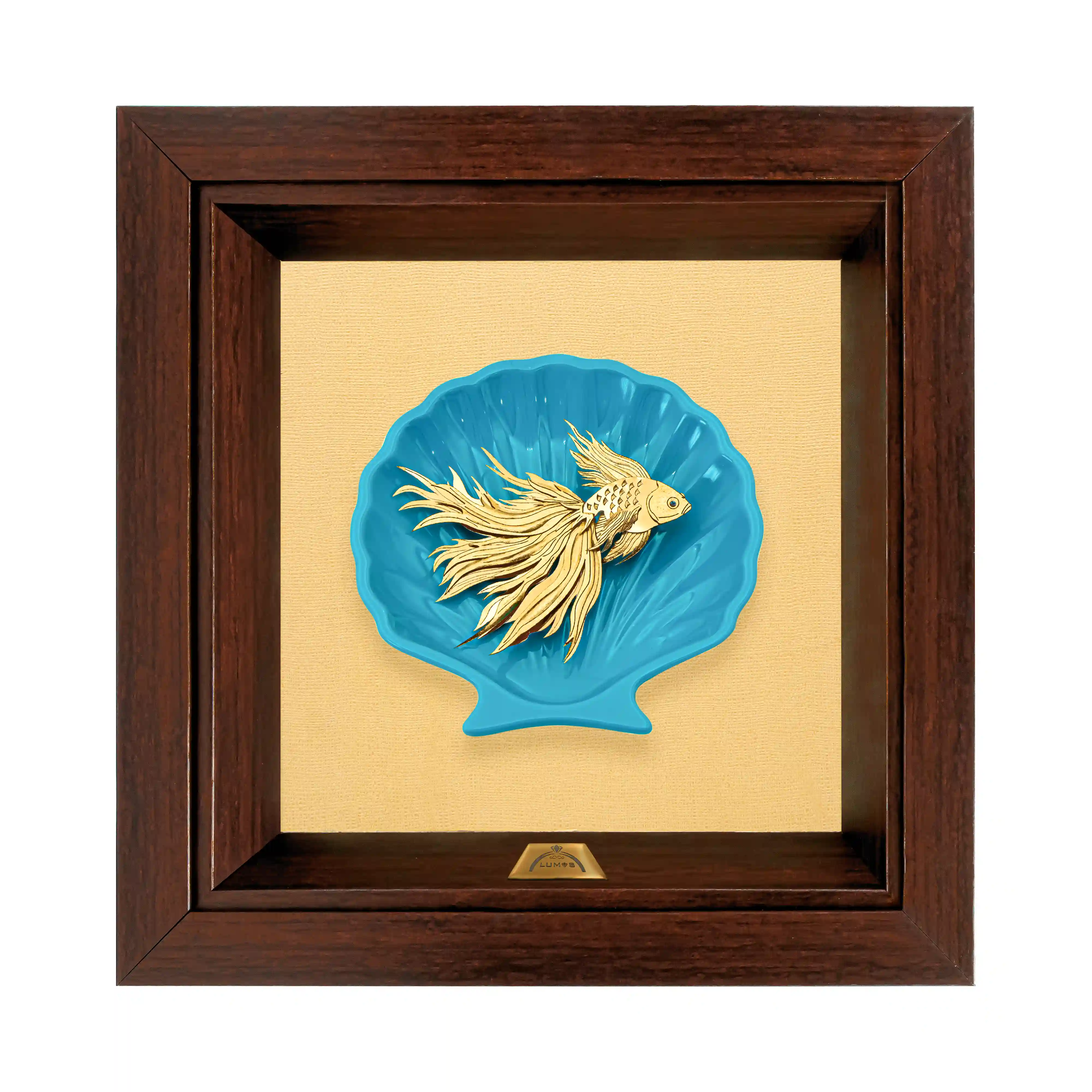 ماهی ظریف با دمهای بلند و مواج، کاملاً با روکش طلای ۲۴ عیار خالص پوشانده شده است تا درخشش آن، یادآور تابش آفتاب بر سطح آب باشد. ماهی طلایی در بستر یک صدف عمیق و سهبُعدی به رنگ فیروزهای دریا قرار گرفته است؛ این ترکیب رنگ، حس نوستالژیک سواحل مدیترانه و ثبات فیروزهی اصیل را القا میکند. قاب تیره و سنگین، مانند یک پنجره کشتی، این منظره لوکس را در دل خود حفظ کرده و دوام و کیفیت ساخت کلکسیونی آن را تضمین مینماید.